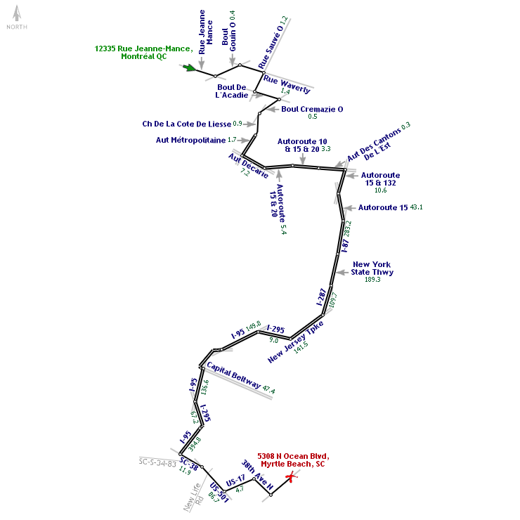 Start: 12335 Rue Jeanne-Mance, Montréal QC End: 5308 N Ocean Blvd, Myrtle Beach, SC 29577 Total Distance: 1727.2 Kilometers Estimated Total Time: 16 hours, 41 minutes |